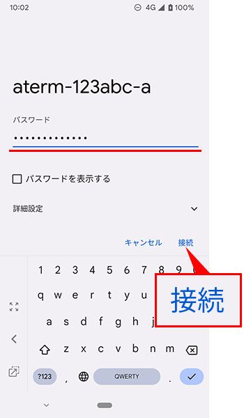 手順冒頭の事前準備で確認したAterm親機の暗号化キーを入力して、【接続】をタップしてください。