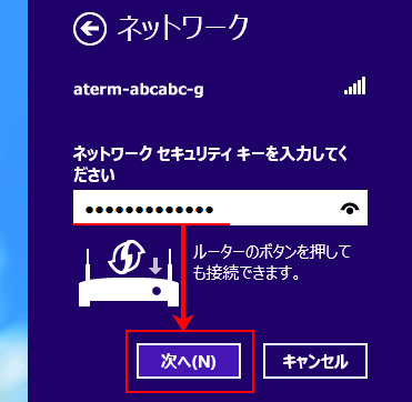 手順冒頭の事前準備で確認したAterm親機の暗号化キーを入力して、【次へ】ボタンを押してください。