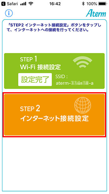 Wi-Fi(無線)設定は以上で完了ですが、インターネット接続の設定が完了していない場合は、以下の画面が表示されますので【STEP2 インターネット接続設定】をタップして、画面の指示に従って設定を行ってください。
