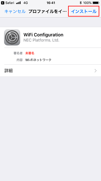 手順4で表示されたWi-Fi設定を、プロファイルとしてiPhoneに保存・設定します。