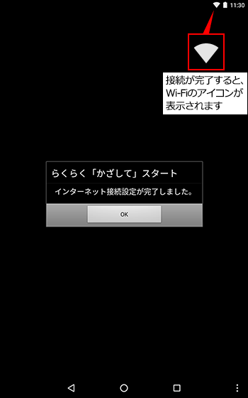 以下の画面が表示されますので、製品に同梱されているWi-Fi設定シート(Wi-Fi設定カード)の「Nマーク」にAndroid端末のNFCリーダー部をかざしてください。