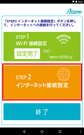 そのあと、以下の画面が表示されますので【STEP2 インターネット接続設定】をタップして、画面の指示に従って設定を行ってください。