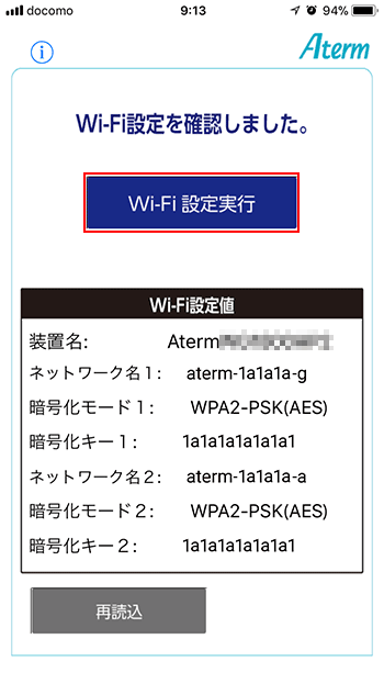 NFCの読み取りに成功すると、Wi-Fi(無線)の設定内容が表示されますので【Wi-Fi設定実行】をタップしてください。