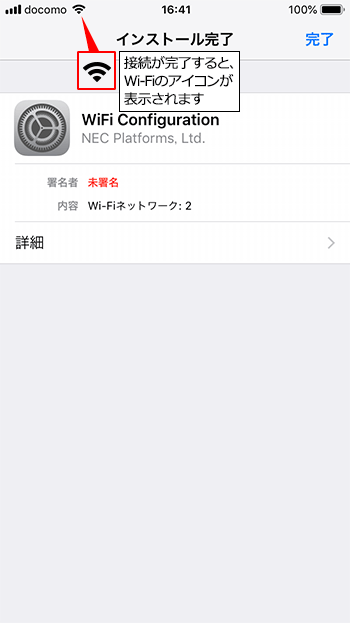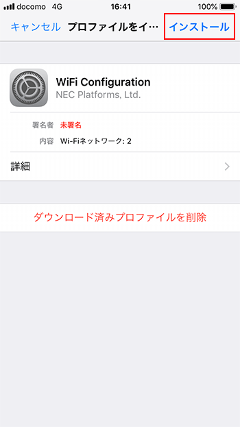 手順4で表示されたWi-Fi設定を、プロファイルとしてiPhoneに保存・設定します。