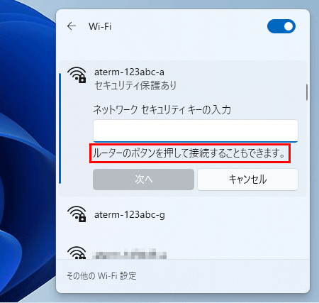 この画面が表示されない場合は、Windowsパソコン側の説明書や仕様をご覧の上、端末がWPSに対応しているかご確認ください。