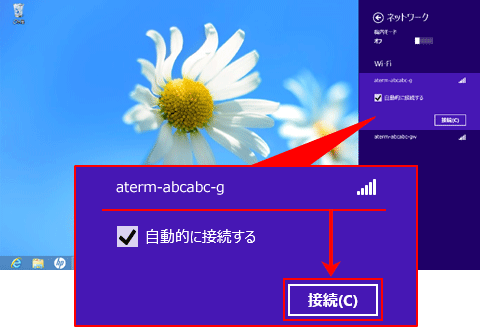 手順冒頭の事前準備で確認したAterm親機のネットワーク名(SSID)を選択して、【接続】ボタンを押してください。