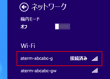 Atermのネットワーク名(SSID)の横には『接続済み』と表示されます。