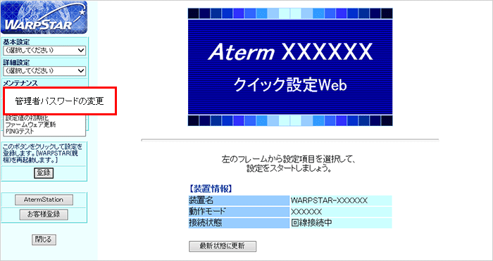 クイック設定Webのメニューから、『メンテナンス』-『管理者パスワードの変更』を選択してください。