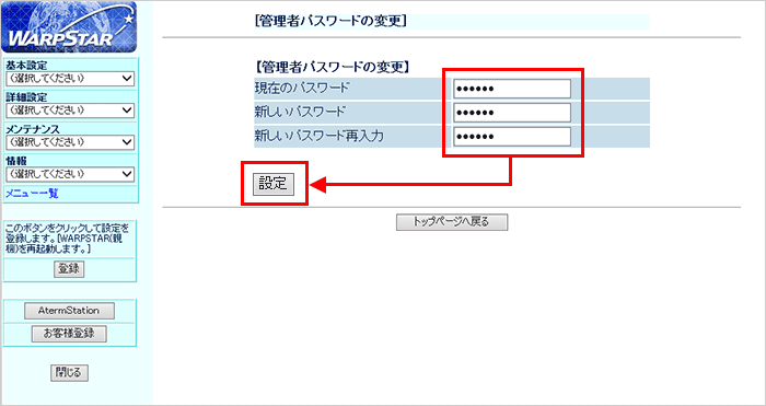 「現在のパスワード」に現在使用中のパスワード、「新しいパスワード」と「新しいパスワード再入力」に変更するパスワードを入力して、【設定】ボタンを押してください。