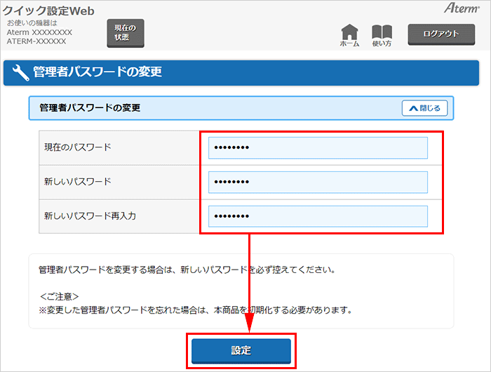 クイック設定Webのログインパスワード(管理者パスワード)変更は、クイック設定Webで行います。