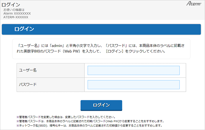 ログインを行う際は、ログイン画面でユーザー名に「admin」、パスワードに手順3で変更したパスワードを入力してください。