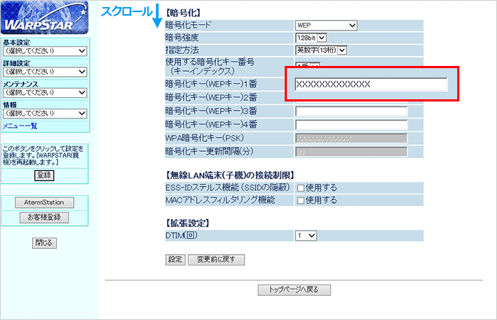 「暗号化キー(WEPキー)1番」の内容を変更します。