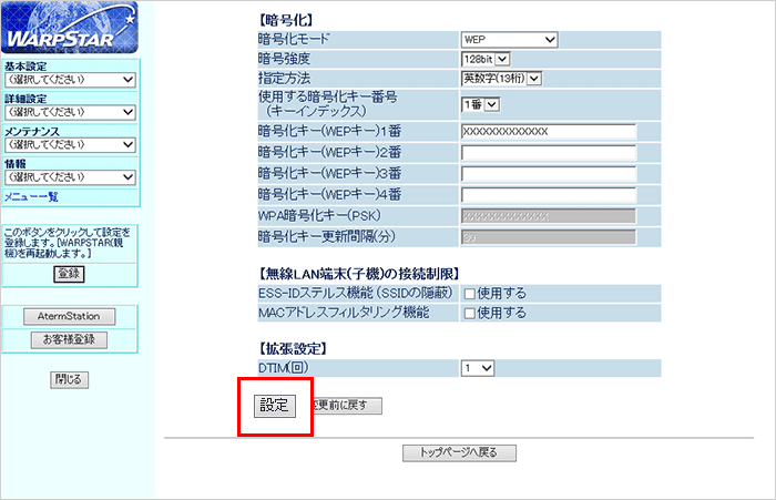 設定完了後は、ここで変更したものがAtermの暗号化キーになります。