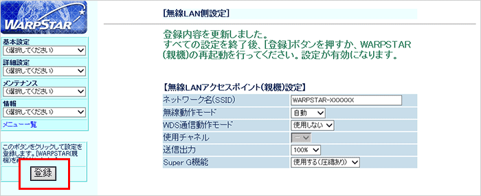 クイック設定Webのメニューから、【登録】ボタンを押してください。