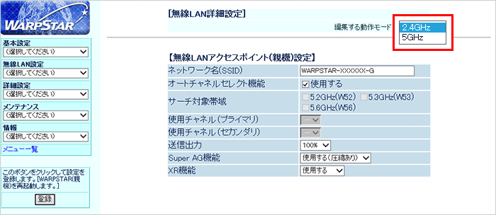 WR7870Sの場合は、「2.4GHz」または「5GHz」、WR7850S・WR7600Hの場合は「802.11b+g」または「802.11a」から選択します。