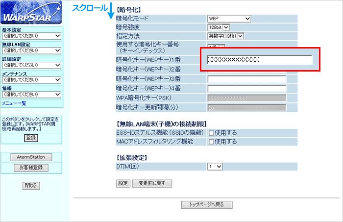 「暗号化キー(WEPキー)1番」の内容を変更します。