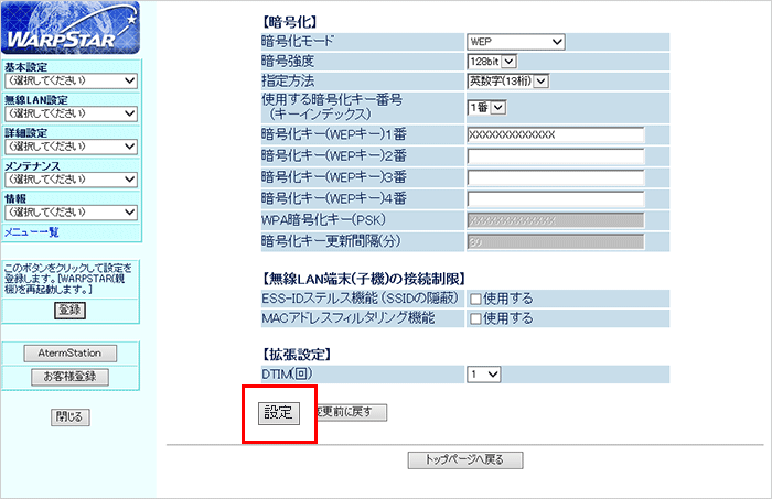 設定完了後は、ここで変更したものがAtermの暗号化キーになります。