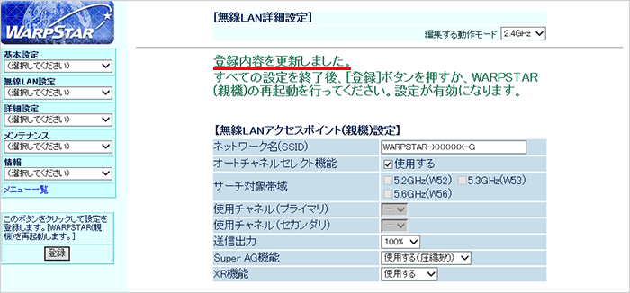 クイック設定Webのメニューから、『無線LAN設定』-『無線LAN詳細設定』を選択してください。