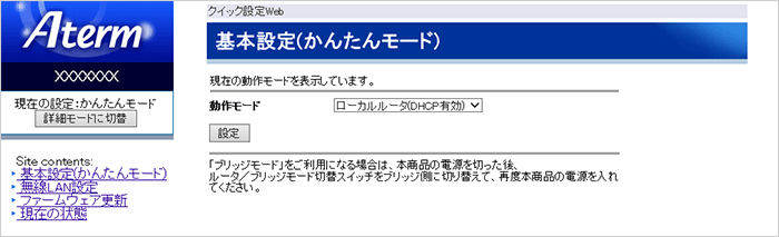 Atermと端末を有線(ETHERNETケーブル)で接続している場合などは、トップページに戻ります。