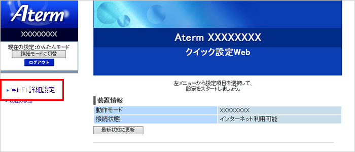 クイック設定Webのメニューから、『Wi-Fi詳細設定』を選択してください。