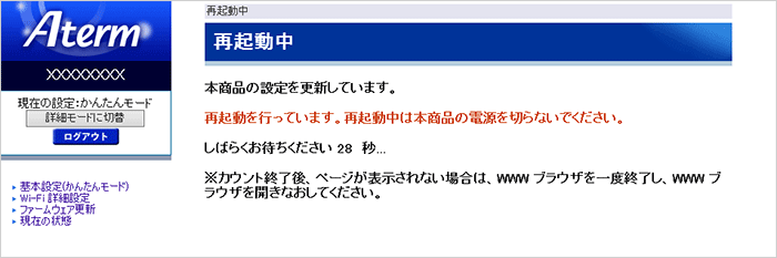 この画面が表示されている間は、絶対にAtermの電源を切らないようにしてください。