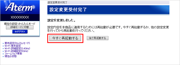『設定変更受付完了』画面が開きますので、【今すぐ再起動する】ボタンを押してください。