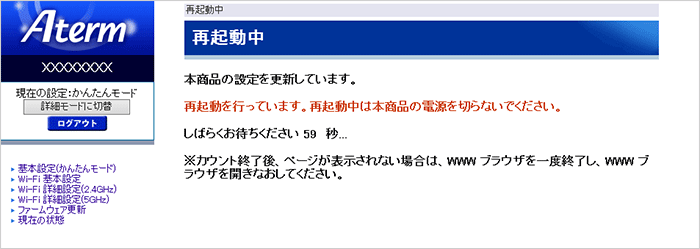 この画面が表示されている間は、絶対にAtermの電源を切らないようにしてください。