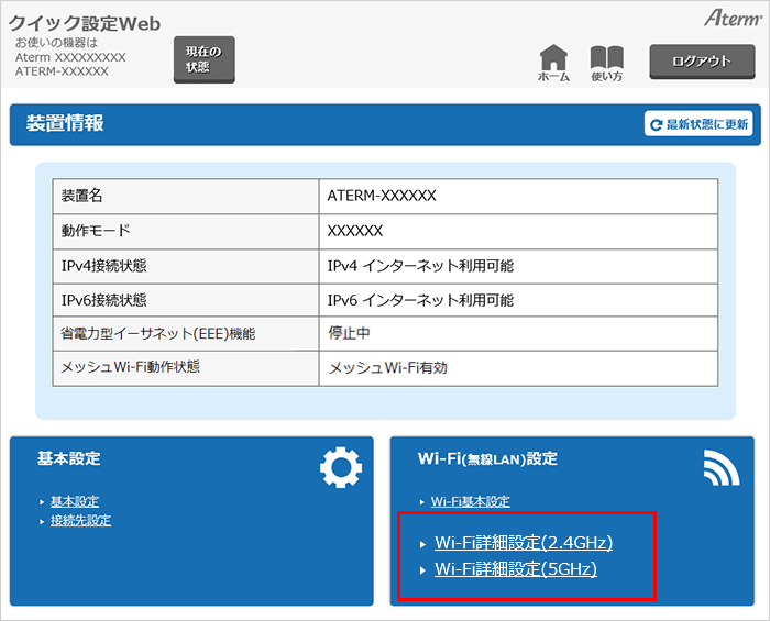 クイック設定Webのメニューから、『Wi-Fi詳細設定(2.4GHz)』または『Wi-Fi詳細設定(5GHz)』を選択してください。
