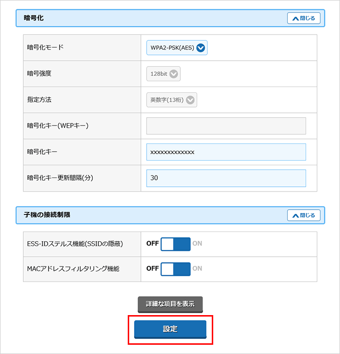 なお、WPA3-SAE(AES)が含まれる暗号化モードを選択した場合、使用できる文字は8〜63桁の半角英数字のみです。