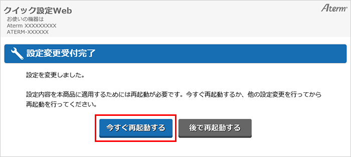 『設定変更受付完了』画面が開きますので、【今すぐ再起動する】ボタンを押してください。