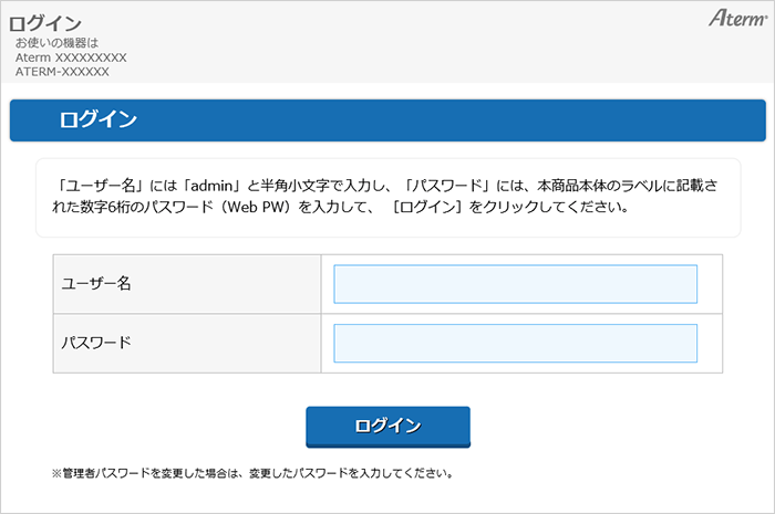 Atermと端末を有線(ETHERNETケーブル)で接続している場合などは、ログイン画面に戻ります。