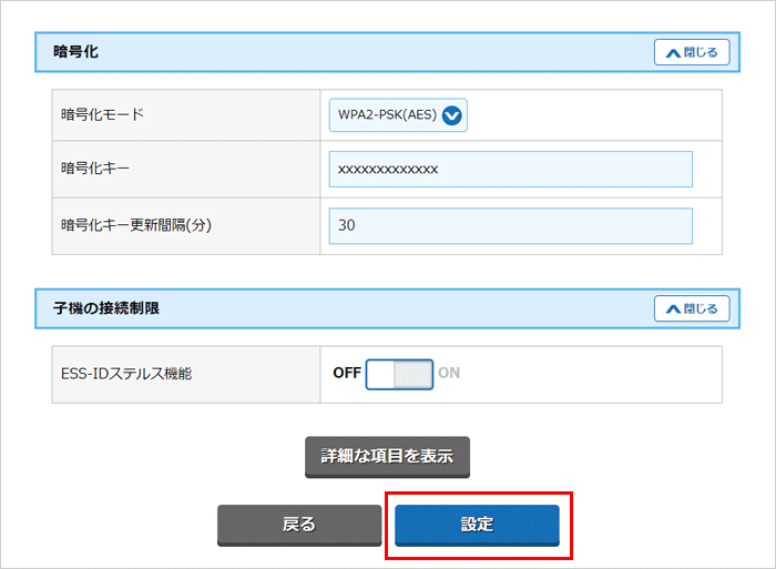※ 「メッシュWi-Fi機能」を無効にすると、メッシュ対応中継機と接続できなくなります。