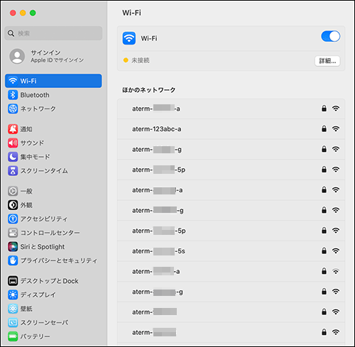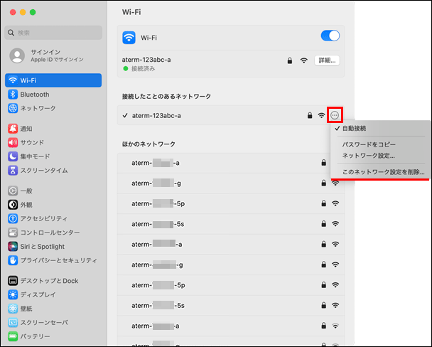 接続したことのあるネットワークから、削除したいAtermのネットワーク名(SSID)の右のアイコン(丸の中に3点リーダー)をクリックして、「このネットワーク設定を削除...」を選択してください。