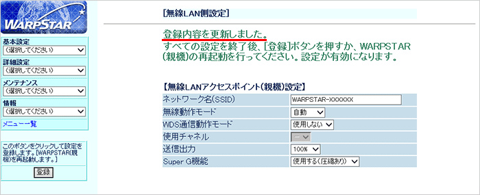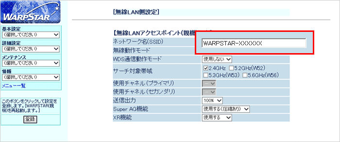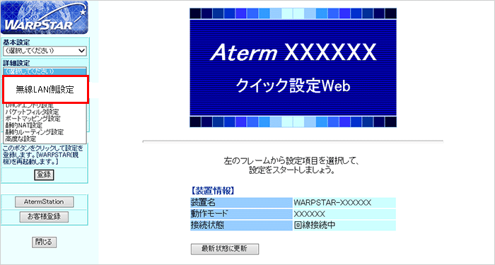 クイック設定Webのメニューから、『詳細設定』-『無線LAN側設定』を選択してください。