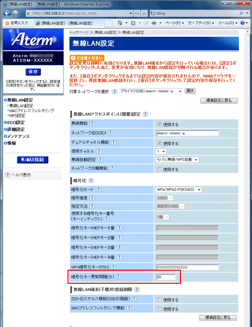 クイック設定Webを起動し、メニュー画面から、「無線LAN設定」-「無線LAN設定」-[暗号化]の「暗号化キー更新間隔(分)」で設定します。