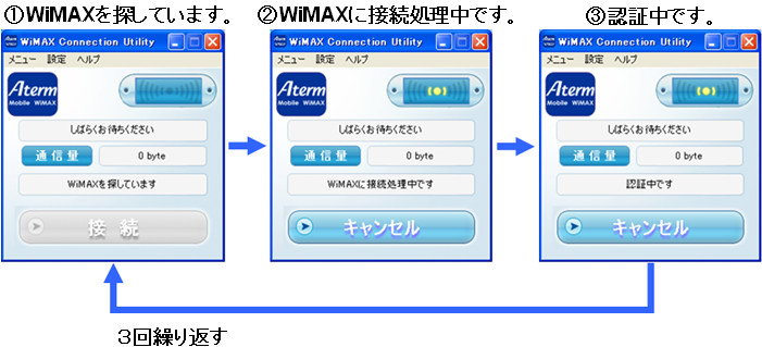 ①「WiMAXを探しています」→②「WiMAXに接続処理中です」→③「認証中です」これを3回繰り返した後、