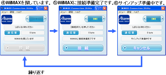 ④「WiMAXを探しています」→⑤「WiMAXに接続準備完了です」→⑥「サインアップ準備中です」を繰り返します。