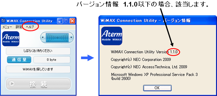 ※ 2009年11月より以前に製造された上記製品をご利用の方は、工場出荷時のWiMAX Connection Utilityのバージョンが1.1.0以下ですので、以下の方法でバージョンを確認し、バージョンアップを行ってください。