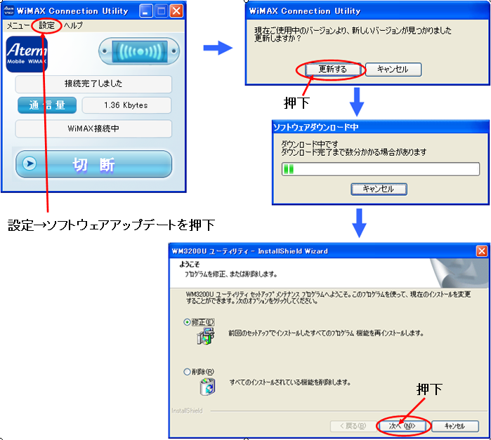 以下のいずれかの方法によって、WiMAX Connection Utility<WiMAXの通信ソフトウェア>をバージョンアップしてください。
