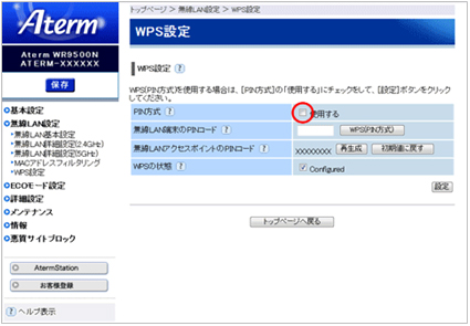 WPS(Wi-Fi Protected Setup)機能を搭載した全てのAterm製品は、ブルートフォース攻撃による不正なPINコードを連続で受け取った場合に、一定時間PINコードの入力を受け付けない等対策を行っておりますが、より安全性を高めるために以降の対処方法を行ったうえでご使用いただくことを推奨します。