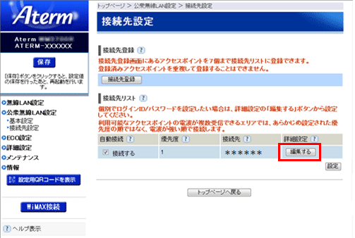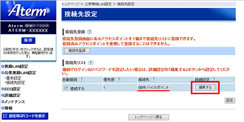 「接続先設定」画面で、【編集する】ボタンを押します。
