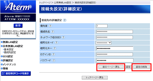 【設定の削除】ボタンを押し、その後【前のページに戻る】ボタンを押します。