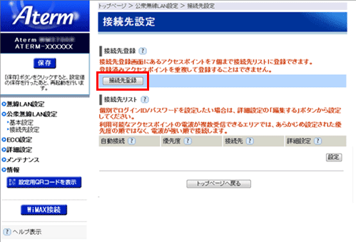 クイック設定Webの「接続先設定」画面(「公衆無線LAN設定」-「接続先設定」を選択で表示)で[接続先リスト]を確認します。