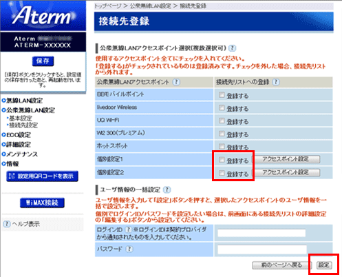 「接続先登録」画面で、「個別設定1」か「個別設定2」の[登録する]にチェックして、【設定】ボタンを押します。