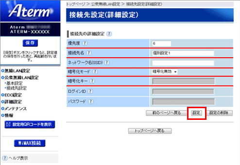 「接続先設定(詳細設定)」画面で、必要項目を入力・選択して、【設定】ボタンを押します。