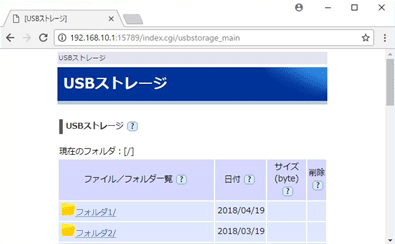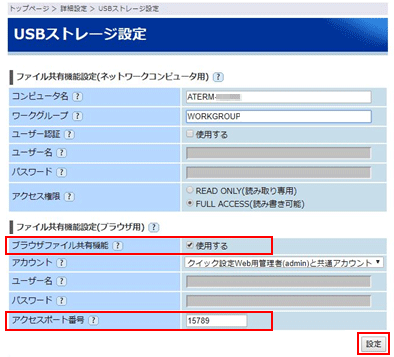 下記の手順にて「ファイル共有機能設定(ブラウザ)」を有効化することで、Atermに接続したUSBストレージ内のファイルにWebブラウザからアクセスができるようになります。