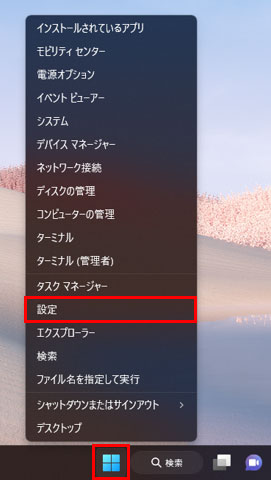Windowsロゴを右クリックし、「設定」をクリックする。