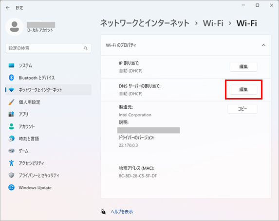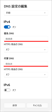 「DNS サーバーの割り当て」の「編集」をクリックする。