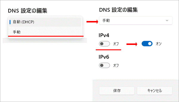 「自動(DHCP)」を「手動」に変更し、「IPv4」を「オン」にする。