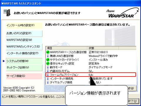 2.ファームウェアバージョン欄に、バージョン情報が表示されます